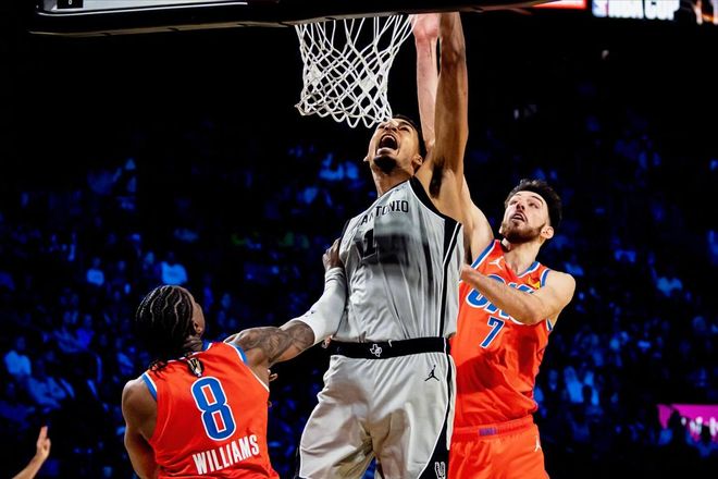 所以,兩隊的分差被迅速縮小,只剩4分。雷霆隊能做的,似乎只有用防守反擊得分,陣地戰根本沒有任何機會。而隨著文班亞馬在進攻端找回手感,這支完全體的馬刺隊,開始向雷霆隊這支看起來無法戰勝的高峰發起沖擊。隨著文班亞馬迎著哈滕大號三分干拔命中,半場結束前,馬刺隊將分差追至3分。易邊再戰,??怂狗磽羯匣@得手,成功完成反超。從一度落后16分到反超,這一波逆轉給足了馬刺隊信心。在這之后,馬刺隊一直穩住比分。不得不說,雷霆這樣年輕的冠軍球隊,看起來確實只有馬刺這樣同樣年輕,也同樣有競爭力的球隊才能對其造成威脅。